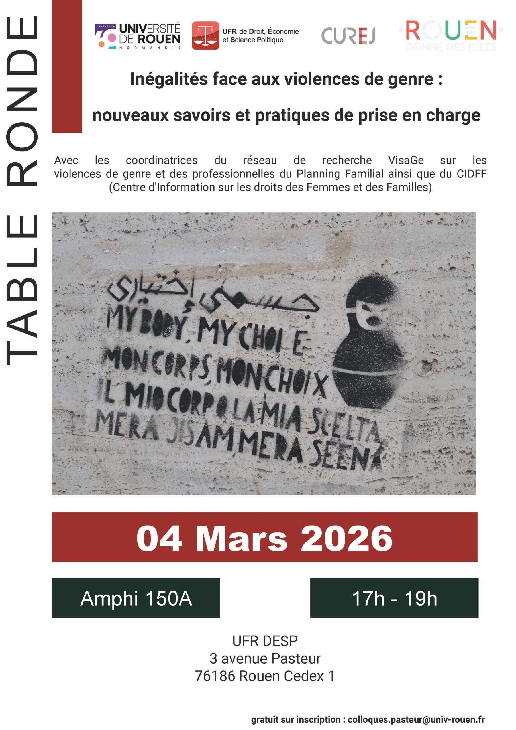 Table ronde Inégalités face aux violences de genre : nouveaux savoirs et pratiques de prise en charge Organisée par Emeline Fourment, CUREJ 4 mars 2026 17h00-19h00 Avec Margot Giacinti, Pauline Delage, Tania Lejbowicz : réseau de recherche VisaGe Laura Slimani, Adjointe au Maire de Rouen en charge de l’égalité femmes / hommes, Ville de Rouen… Poursuivre la lecture Table-ronde. Inégalités face aux violences de genre : nouveaux savoirs et pratiques de prise en charge